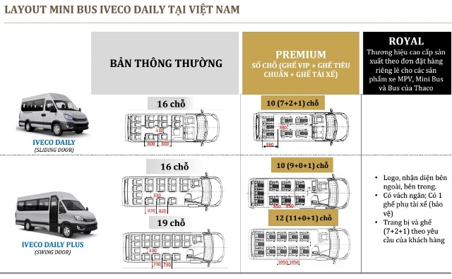 Iveco Daily Premium (1 ghế tài, 2 ghế tiêu chuẩn, 07 ghế VIP) | 1.309.000.000đ |