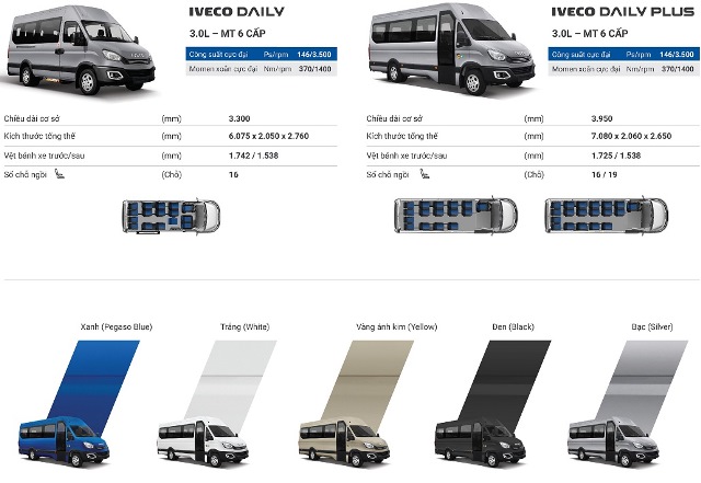 Xe Iveco daily thương mại hạng nhẹ, có 2 phiên bản Iveco Daily 16 chỗ và Iveco Daily Plus 19 chỗ, phù hợp với nhu cầu vận tải các tuyến cố định, dịch vụ du lịch, đưa đón học sinh.