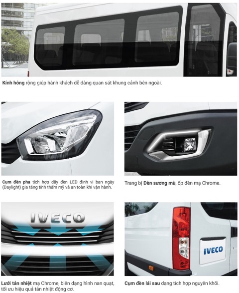 • Iveco 16 chỗ được thiết kế với phong cách hiện đại, mạnh mẽ với những đường gân nổi từ mặt trước và kéo dài theo dọc thân xe.