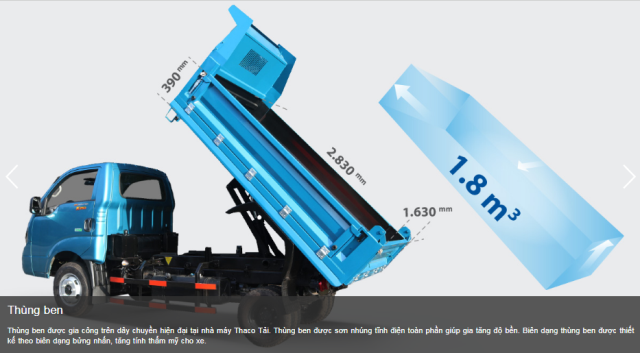 | Kích thước lòng thùng (DxRxC) | mm | 2.830 x 1.630 x 390 ~ 1.8m3 |
