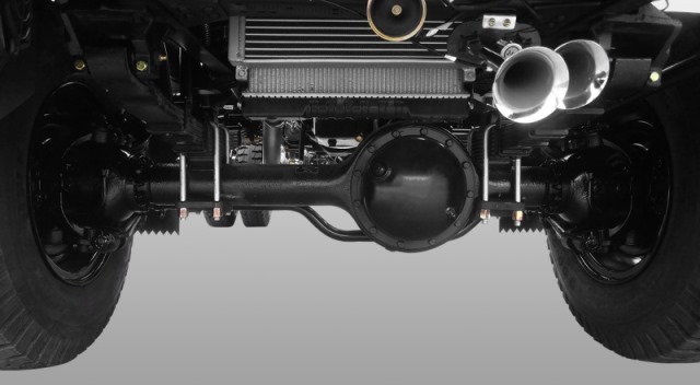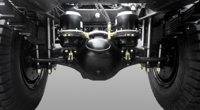 Hệ thống treo Trước 7 lá nhíp kèm giảm chấn thủy lực, treo sau 14 nhíp lá và nhíp sau phụ 7 lá.
